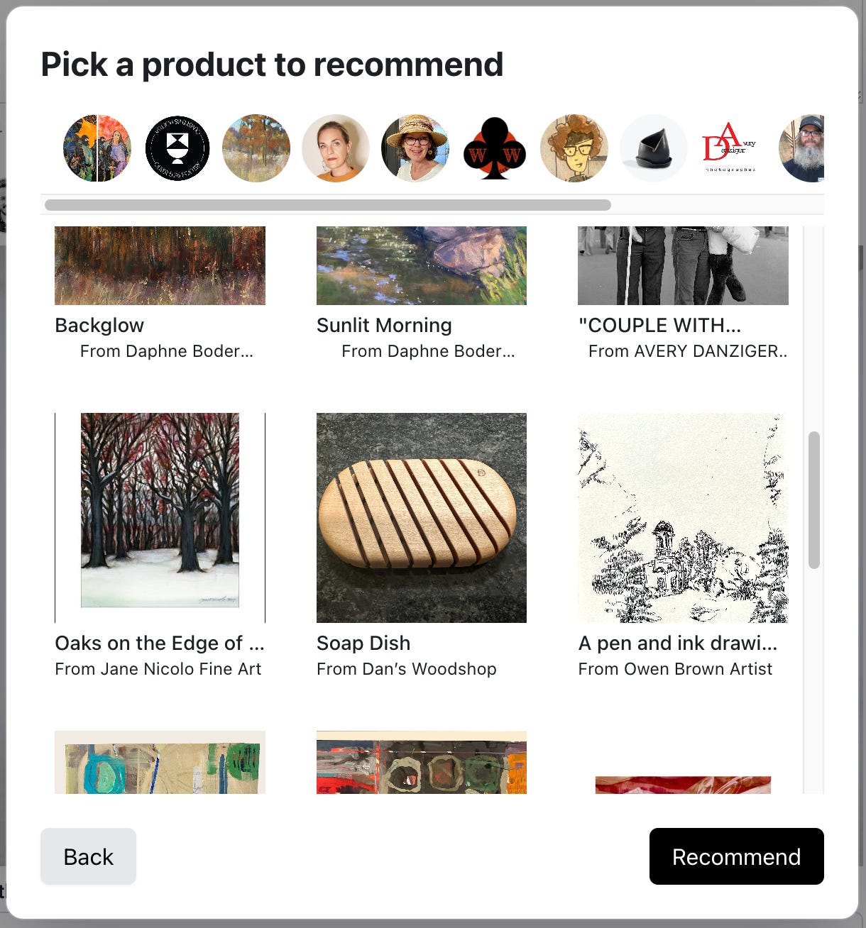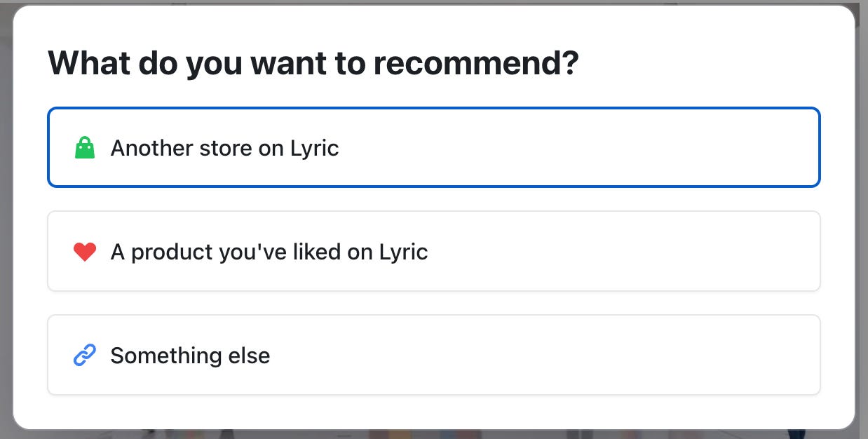 If you want to recommend a specific product, you’ll see a screen showing you all the products you’ve favorited on Lyric, and you can select any one of them to promote. (and if you haven’t favorited any products yet, now is a great time to start doing so!)